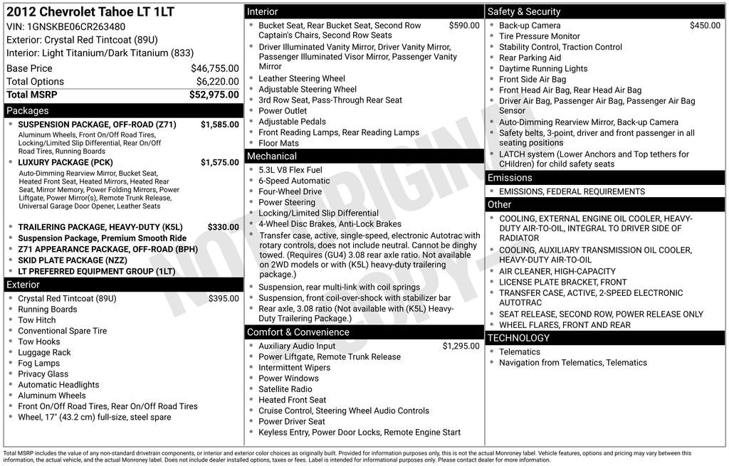 4D Sport Utility 2012 Chevrolet Tahoe LT Z71 4WD Vortec 5.3L V8 SFI Flex Fuel Iron Block 6-Speed Automatic Electronic with Overdrive