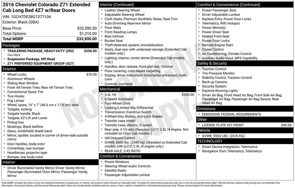 Certification Program Details: Beardmore Powertrain Certified Vehicles include a 3 month or 3,000 miles limited warrantyBlack 2016 Chevrolet Colorado Z71 New Price! Certified. Leather Seats, Navigation System, Backup Camera, Recent Oil Service, Fully Detailed, Remote Keyless Entry, Heated Seats, Remote Vehicle Starter, Steering Wheel Controls, ACCIDENT FREE AUTOCHECK. .....MORE and MORE... it's BEARDMORE.Beardmore Powertrain Certified with 3 months or 3,000 miles of Powertrain Warranty*. Engine, Transmission, Drive Axle(s), Transfer Case are covered. *Excludes Routine Maintenance.17/24 City/Highway MPG2016 Chevrolet Colorado Z71 4WD 3.6L V6 DGI DOHC VVT 6-Speed AutomaticAwards:* JD Power Automotive Performance, Execution and Layout (APEAL) Study * Motor Trend Truck of the Year * 2016 KBB.com 5-Year Cost to Own Awards * 2016 KBB.com Best Buy Awards Finalist * 2016 KBB.com Best Resale Value AwardsReviews:* Comfortable ride; capable and fuel-efficient diesel engine; many available high-tech features; maneuverable size. Source: Edmunds