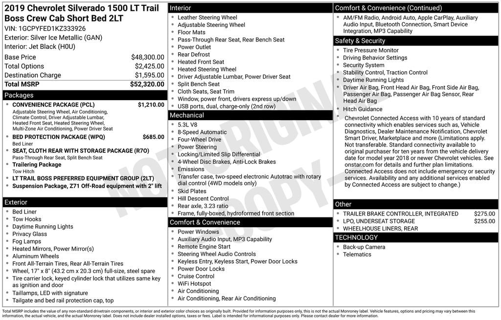 Certification Program Details: Beardmore Certified Vehicles include a 6 month or 6,000 miles limited warranty and a 2 year or 100,000 mile powertrain warranty.Silver Ice Metallic 2019 Chevrolet Silverado 1500 LT Trail Boss Certified. Odometer is 15399 miles below market average! Leather Seats, Sunroof/Moonroof, Navigation System, Bluetooth, Backup Camera, Recent Oil Service, Fully Detailed, Remote Keyless Entry, Heated Seats, Premium Audio, Steering Wheel Controls, ACCIDENT FREE AUTOCHECK. .....MORE and MORE... it's BEARDMORE.Beardmore Certified with 6 month or 6,000 miles of warranty and 2 years or 100,000 miles of power train warranty. Located in Bellevue, but serving the greater Omaha areas, including La Vista, Papillion, Millard, Council Bluffs, Lincoln and Plattsmouth. Se Habla Espanol! Need Financing? Come see what our Finance Specialists can do for you. All Apps Accepted. Good Credit, Bad Credit, Not Credit, No Problem.15/20 City/Highway MPG4D Crew Cab 2019 Chevrolet Silverado 1500 LT Trail Boss 4WD EcoTec3 5.3L V8 8-Speed Automatic