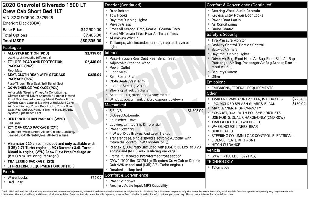 Black 2020 Chevrolet Silverado 1500 LT Odometer is 59283 miles below market average! Bluetooth, Backup Camera, Recent Oil Service, Fully Detailed, Remote Keyless Entry, Remote Vehicle Starter, Steering Wheel Controls, ACCIDENT FREE AUTOCHECK. .....MORE and MORE... it's BEARDMORE.