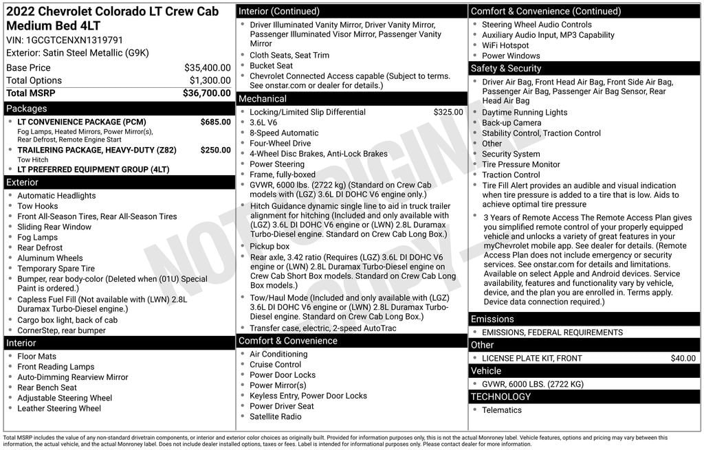 Satin Steel Metallic 2022 Chevrolet Colorado LT Certified. Priced below KBB Fair Purchase Price! Backup Camera, Recent Oil Service, Fully Detailed, Remote Keyless Entry, Remote Vehicle Starter, Steering Wheel Controls, ACCIDENT FREE AUTOCHECK. .....MORE and MORE... it's BEARDMORE.