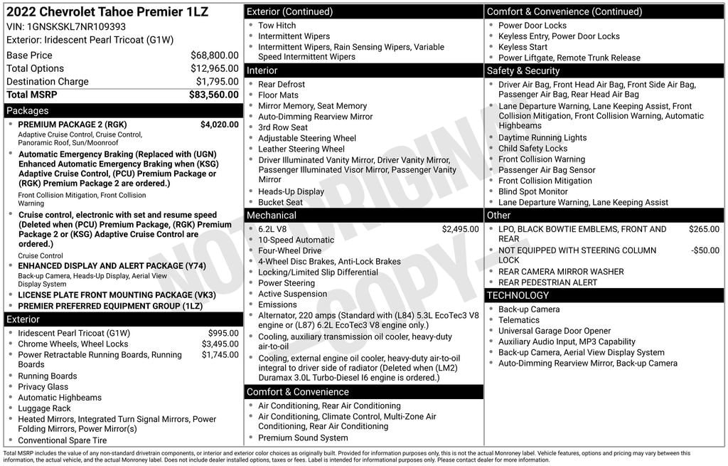 Iridescent Pearl Tricoat 2022 Chevrolet Tahoe Premier Certified. Leather Seats, Sunroof/Moonroof, Bluetooth, Backup Camera, Recent Oil Service, Fully Detailed, Remote Keyless Entry, Heated Seats, Premium Audio, Steering Wheel Controls. .....MORE and MORE... it's BEARDMORE.
